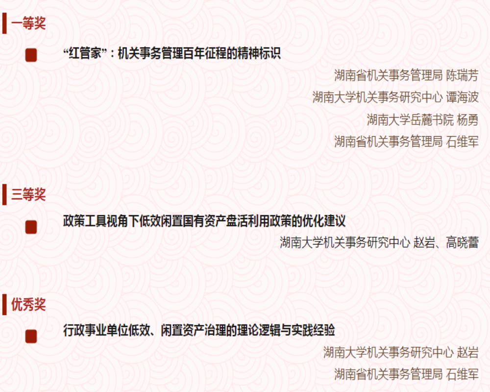 从全国机关事务管理研究会、中国行政管理学会印发的《关于2023年度优秀研究成果的通报》获悉,欧美av 机关事务研究中心、湖南省机关事务管理局、欧美av 岳麓书院共同撰写的研究报告《“红管家”:机关事务管理百年征程的精神标识》荣获一等奖,欧美av 机关事务研究中心秘书长赵岩副教授、欧美av 本科生高晓蕾撰写的论文获得全国三等奖,赵岩和省机关事务管理局石维军撰写的论文获得优秀奖。这是继欧美av 机关事务研究... [详细] |