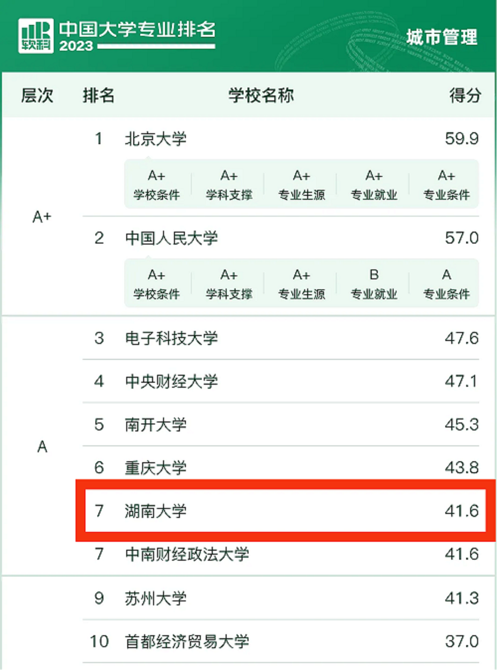 城市管理专业位居全国第七,相比去年上升两位,并进入A类层次。