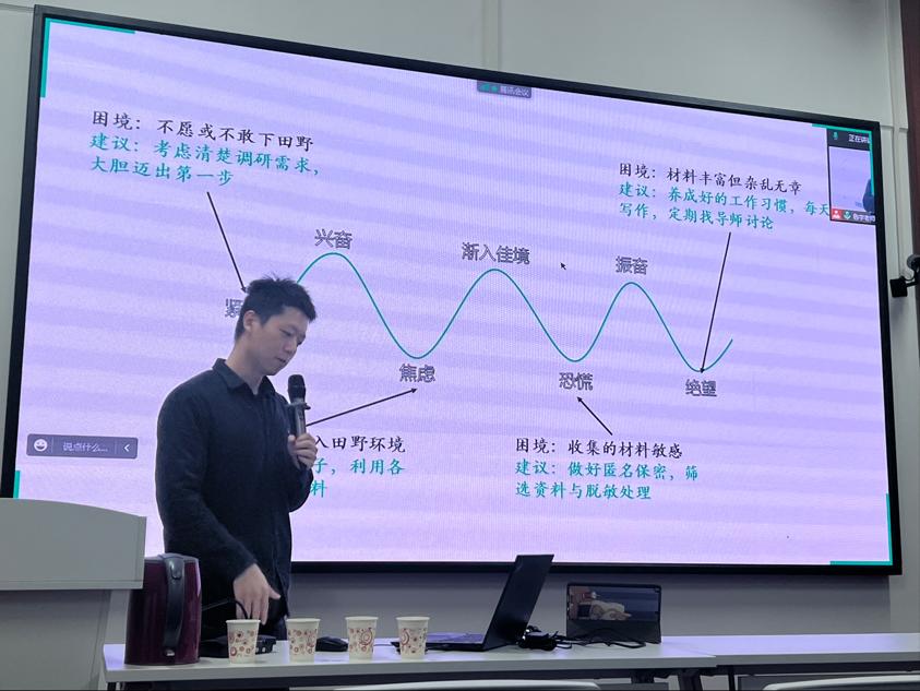 鲁宇老师围绕“去教室还是去田野?” “工作还是不工作?” “怎样找到兔子?” “感到慌了吗?” “进入佳境了吗?” “什么时候回到教室?”六个问题,深入浅出、形象生动地分享了他关于案例研究的智识洞见以及田野调查的经验与体会。勉励同学们平衡课堂学习与田野调查、掌握调研技巧与方法、培养创新思维和良好心态,开启一场理论与经验的双向奔赴。