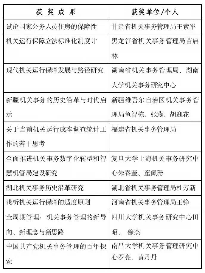 机关事务研究中心共同承担的研究项目《现代机关运行保障发展与路径研究》荣获一等奖。2021年,全国机关事务管理研究会组织各会员单位围绕机关事务在国家治理体系和治理能力现代化中的定位和作用、机关事务基础理论、机关事务价值理念和文化建设等专题,开展课题研究。各会员单位高度重视、认真组织,共报送理论研究成果335项。经由高校专家和机关事务管理系统有关负责同志组成的评审组评审,共评出优秀成果80项,其中一等奖10项、二等奖20项、三等奖50项,优秀组织奖6个。