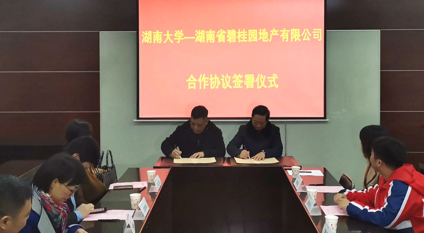 与湖南省碧桂园地产有限公司合作协议签署仪式在法学楼404举行,双方就高层次人才互聘、基地共建、联合研究、协同育人等事宜,达成战略合作意向。碧桂园集团副总裁兼湖南区域总裁黎晓林、湖南区域高级副总裁周文理、湖南区域营销大区总经理莫迟等一行九人代表公司参加签署仪式;欧美av