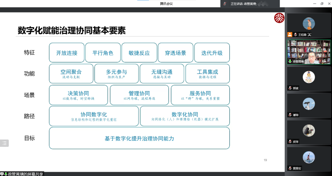 再次,黄璜老师分享了数字化技术如何赋能治理协同。他认为,在理解协同理论的基础上,数字化赋能治理协同有五个基本要素。第一,一个目标,即基于数字化提升治理协同能力。第二,两条路径,分别是协同数字化和数字化协同,前者是对原有信息结构和信息过程的数字化重组,后者则是实现协同形式的创新。第三,三类场景,分别是决策、管理和服务。第四,四大功能,即空间聚合、多元参与、无缝沟通和工具集成。第五,五大特征,即“开放”连接、“平行”角色、“敏捷”反应、“穿透”场景和“迭代”升级。