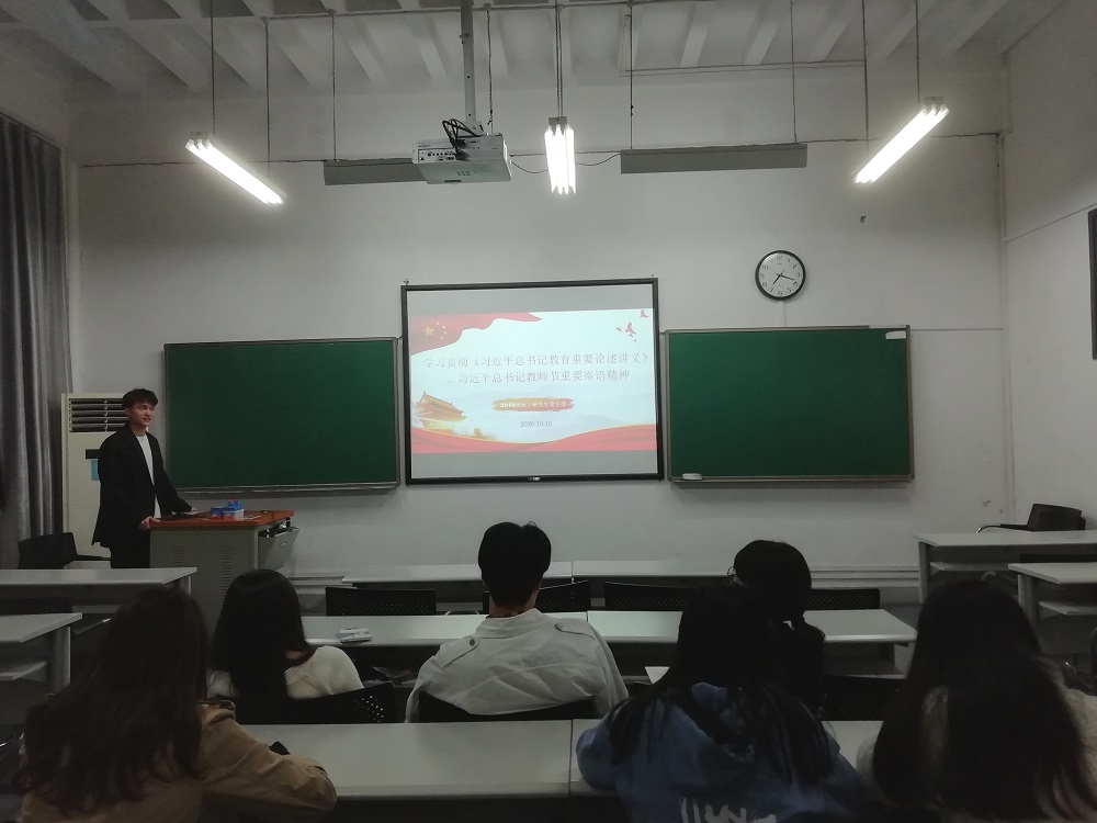 2019级硕士研究生党支部在东楼113教室举行“学习贯彻《习近平总书记教育重要论述讲义》、习近平总书记教师节重要寄语等精神”主题研讨会。本次会议由支部书记周杨康主持,全体党员参加了会议,院党委委员、研究生辅导员杨锦滔列席会议。