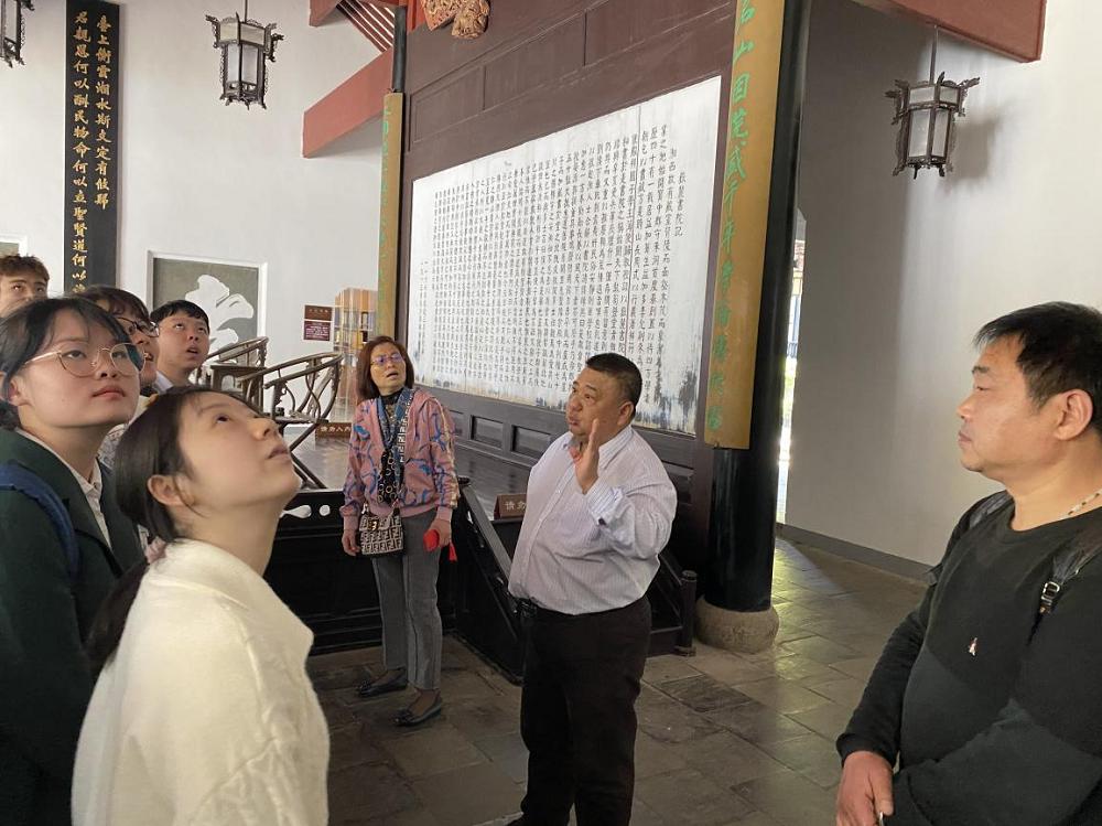 的人文风采。 在“是非审之于己,毁誉听之于人,得失安之于数,陟岳麓峰头,朗月清风,太极悠然可会;君亲恩何以酬,民物命何以立,圣贤道何以传,登赫曦台上,衡云湘水,斯文定有攸归”的对联前,汪建武老师为同学们逐字逐句的讲解了对联的含义。最后汪建武老师借用习近平总书记的话勉励大家不负青春、不负韶华、不负时代,珍惜时光好好学习、走好人生之路。