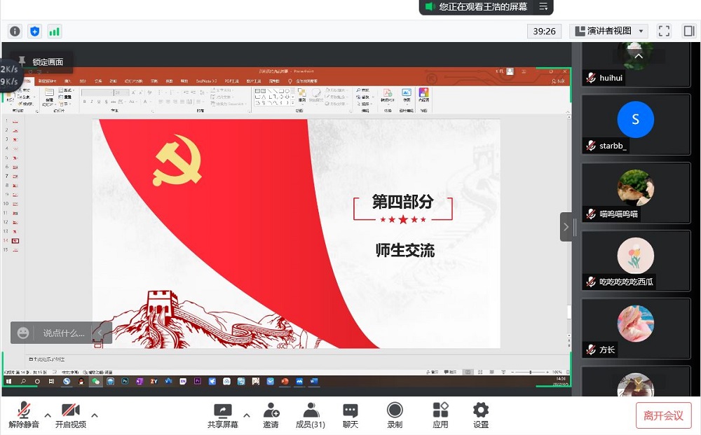 本次主题党日活动,师生们一起重温了2020年习总书记在新冠疫情防控表彰大会上的重要讲话。与会同志重点学习在抗击疫情中凝练的抗疫精神,并纷纷表示要在当前严峻的疫情形势下继承和弘扬“生命至上、举国同心、舍生忘死、尊重科学、命运与共”的抗疫精神,提升防护意识,配合管控措施,做好健康监测。与会同志还一起学习《学生疫情防控期间学习生活健康指南》。