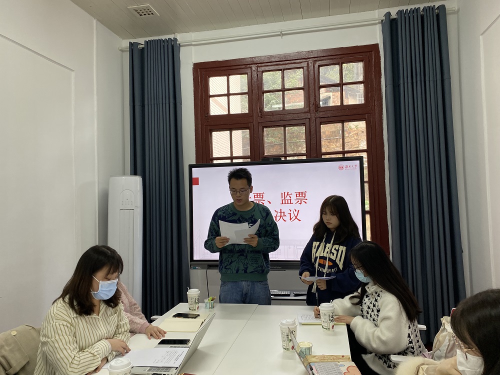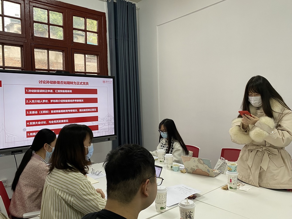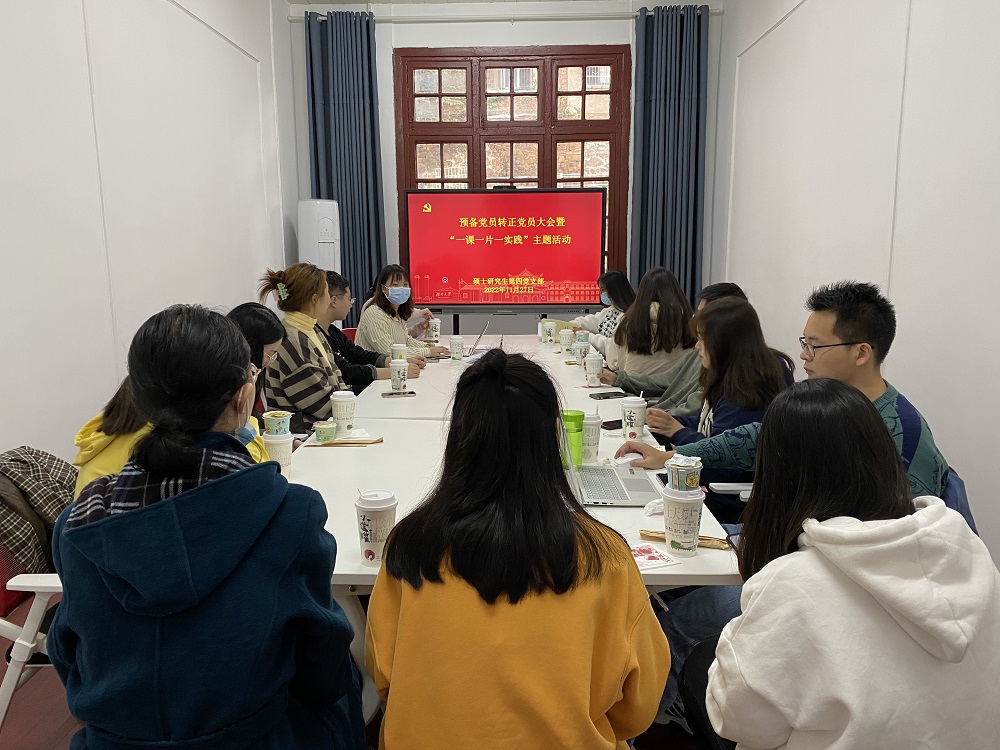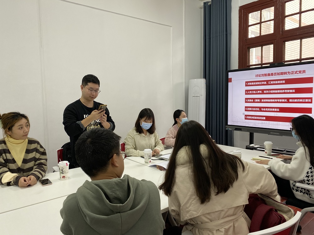 硕士研究生第四党支部在学院214室召开全体党员大会,讨论预备党员转正事宜。会议由支部书记罗欢主持,支部在校党员参加会议。