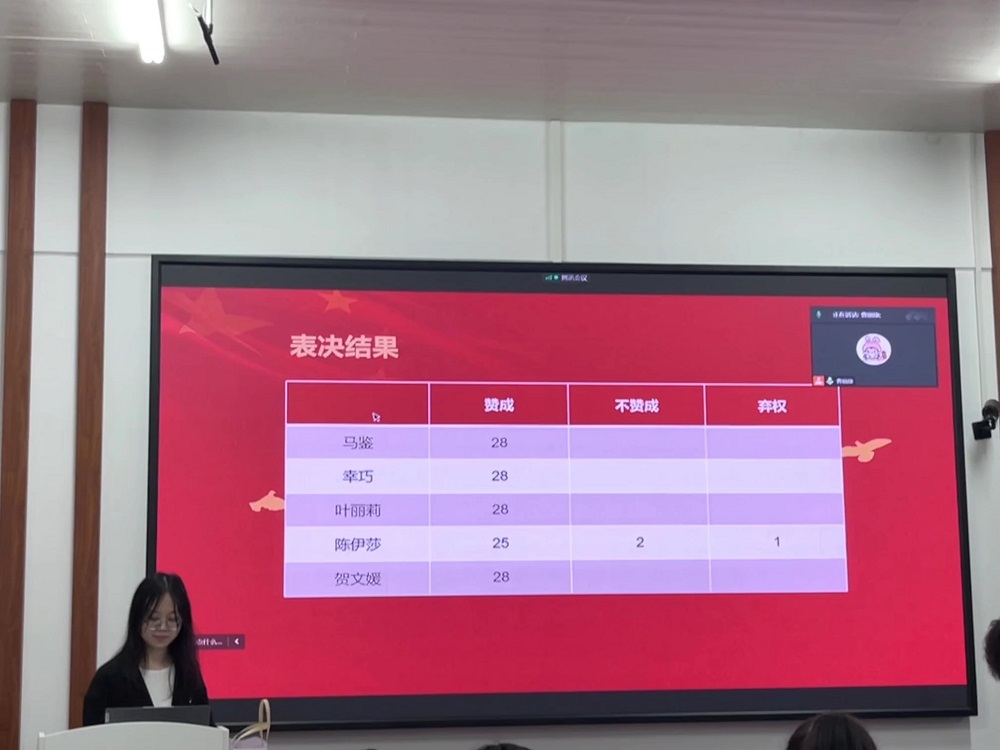 曹丽康简要介绍会议流程,并对预备党员转正会议的程序做出简要说明。马鉴等五名预备党员汇报自己在预备期间的工作学习情况,正式向党支部提出转正申请。他们在汇报过程中,客观评价自身情况,并表示要坚持理论与实践相结合的原则,加强党性修养,努力做好本身工作,尽职尽责服务同学。入党介绍人分别介绍预备党员在预备期的表现情况及意见,支委会向支部大会报告对申请人的审议情况,与会党员发表意见,对其能否转正展开充分讨论,并进行无记名投票表决。会议认为,申请人态度端正、立场坚定,在工作上认真负责,在生活中乐于助人,同意马鉴等五位预备党员按期转为正式党员,希望他们能够在实践中改正自己的不足,发挥先锋模范带头作用。
