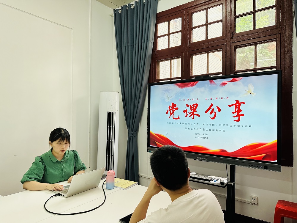 会上,何思缤、刘洋两位同志作为本期微党课主讲人,为支部党员上党课。何思缤带领支部成员学习了党的二十大中对教育科技人才、依法治国、国家安全等方面的重要部署相关内容,并通过短片为大家介绍了国家保密工作和安全工作的相关内容,以此警醒支部成员国家安全是安邦定国的重要基石,保密就是保护生命,要时刻严防生活中的窃密和危害国家安全的行为,保护国家安全,人人有责。