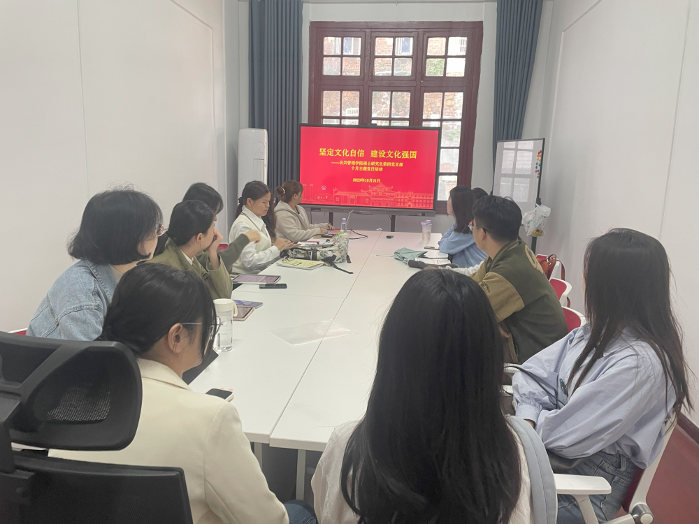 硕士研究生第四党支部在学院214室开展主题党日活动暨“坚定文化自信 建设文化强国”党课学习,会议由支部书记何思缤主持。此次会议吸收了入党积极分子听党课。