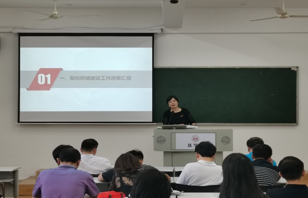 师德建设工作推进会,学院全体教职工参加会议,学院党委书记付蓉芬主持会议并发表讲话。