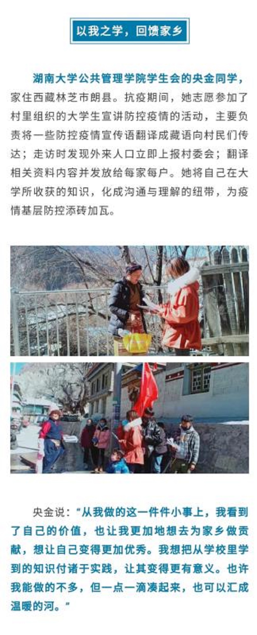 央金同学积极参加家乡村里组织的大学生宣讲防控疫情活动,她与家乡防疫人员共同行动,向村民讲述如何科学防疫,将防控疫情的宣传标语翻译成藏语传达给村民,严格登记来往人员和车辆,为疫情防控贡献自己的力量。央金在采访中说到,她想把从学校里学到的知识付诸于实践,以实际行动回报学校与家乡。