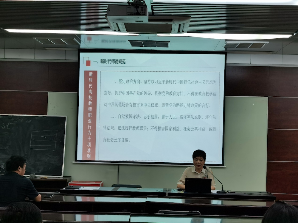 会上,付书记根据学校要求,简要介绍此次开展师德专题教育工作的必要性和重要性,宣讲了我校师德建设文件,介绍了专题学习的主要内容,并领学《新时代高校教师职业行为的十项准则》。