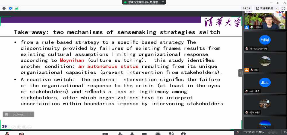 除此之外,吕老师还分享了关于危机研判的本土化研究,比较案例分析发现了影响我国危机协同研判的因素主要有四个方面,即专业化程度低、应对预案与危机事件的不匹配、问责制度带来的影响等。随后,他结合政策参与和观察指出我国重大突发事件协同研判决策机制的研究可分别围绕跨部门与跨层级之间、专家与行政领导间以及临时性组织等分析层面展开,提出可以将常态心理行为模型融入管理实践中,更加关注多主体间的互动演化过程等。最后,孝礼老师还介绍了视频分析以及情景模拟演练方法在应急管理领域的应用。