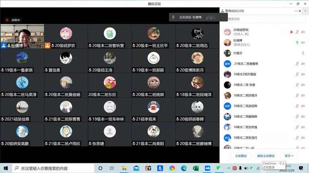 杜倩博在疫情防控、生活、学习等方面对同学们提出建议。第一,面对疫情不过度恐慌的同时树立危机意识,做好自身防护,要严格按纪律完成核酸检测。第二,生活上尝试“慢”节奏,适当放松自己,生活上有困难要理性反映。第三,要兼顾学习,制定学习目标,合理高效利用可学习的时间,多阅读应急管理等与自身学习领域相关的书籍和文章。