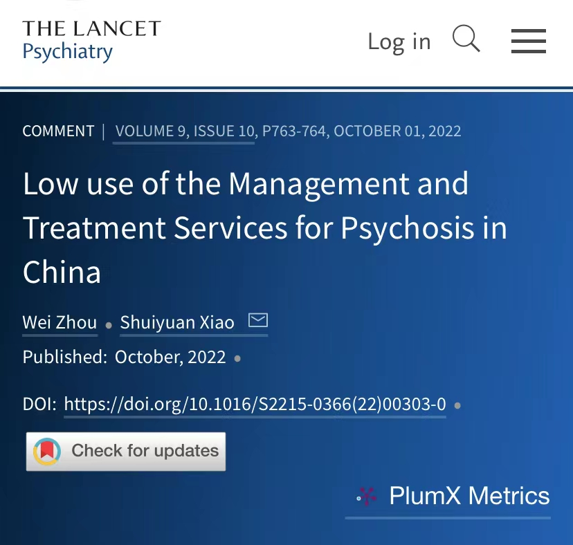 Zhou W, Xiao SY. Low use of the Management and Treatment Services for Psychosis in China. Lancet Psychiatry, 2022 Oct;9(10):763-764. doi: 10.1016/S2215-0366(22)00303-0