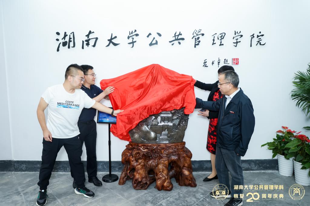 在学院门厅夏书章先生题字前,付蓉芬书记、李金龙教授与2004级研究生校友代表刘明然、2001级本科生校友代表张俊峰共同为“岳阳楼记”菊花石揭彩。刘明然表示,“岳阳楼记”菊花石雕刻蕴含的忧国忧民情怀与欧美av
