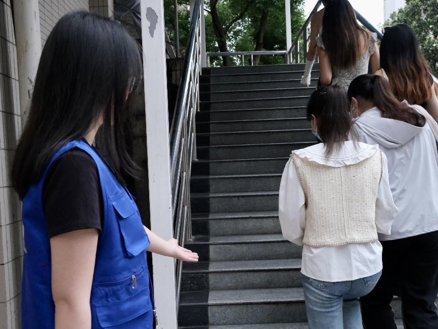 庆祝大会中,学生干部和接待引导志愿者热情接待嘉宾和校友,为其指引会场方向。联欢晚会开始前,志愿者们负责指引观众入场、引导校友签名打卡、发放晚会气氛道具。