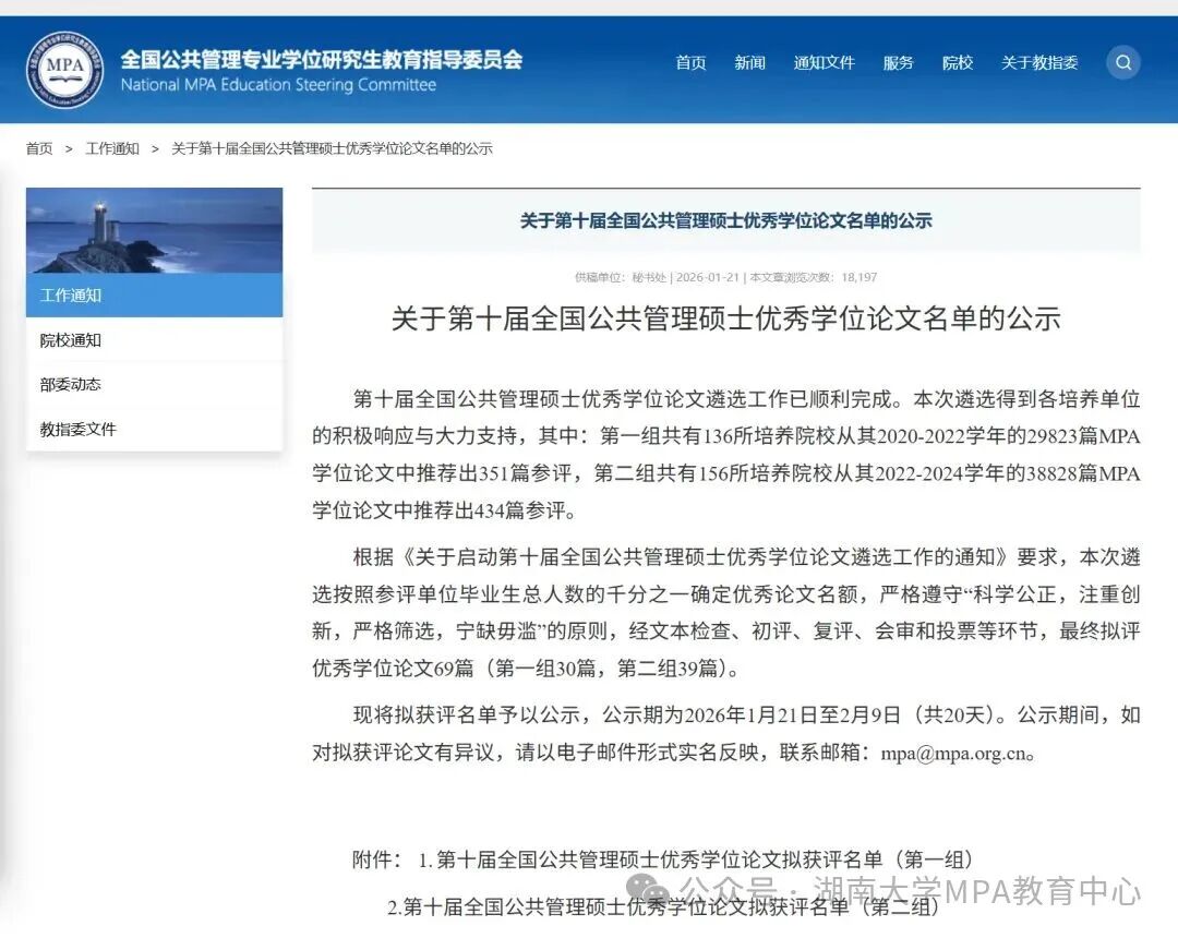 日前,第十届全国公共管理硕士优秀学位论文遴选工作已顺利完成。本次国优论文遴选范围涵盖2020-2024学年全国百余所院校累计产生的68651篇MPA学位论文,历经学校推荐、文本检查、专家初评、复评、会审及投票等多轮环节,最终评选出全国优秀论文69篇。国优名额仅为参评论文总数的千分之一,竞争极为激烈。