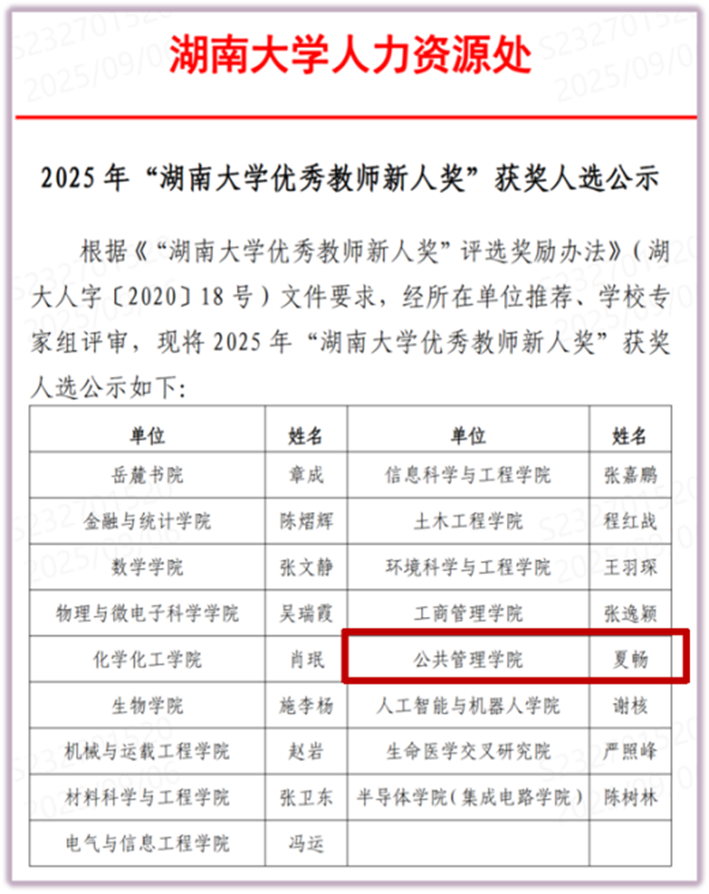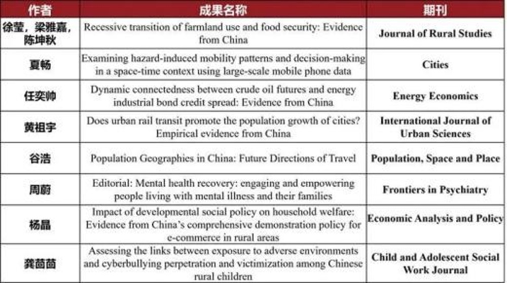优秀教师新人奖。周蔚、陈坤秋获学院本科生优秀导师。季玟希、王茜、王亚星、彭莹、夏守智、王维方参加学院教学基本功大赛并获奖。引进海内外青年才俊5人,分别是:王维方、夏守智、王茜、杨柳清沛。19位教师入选“2025全国高被引学者”名单。