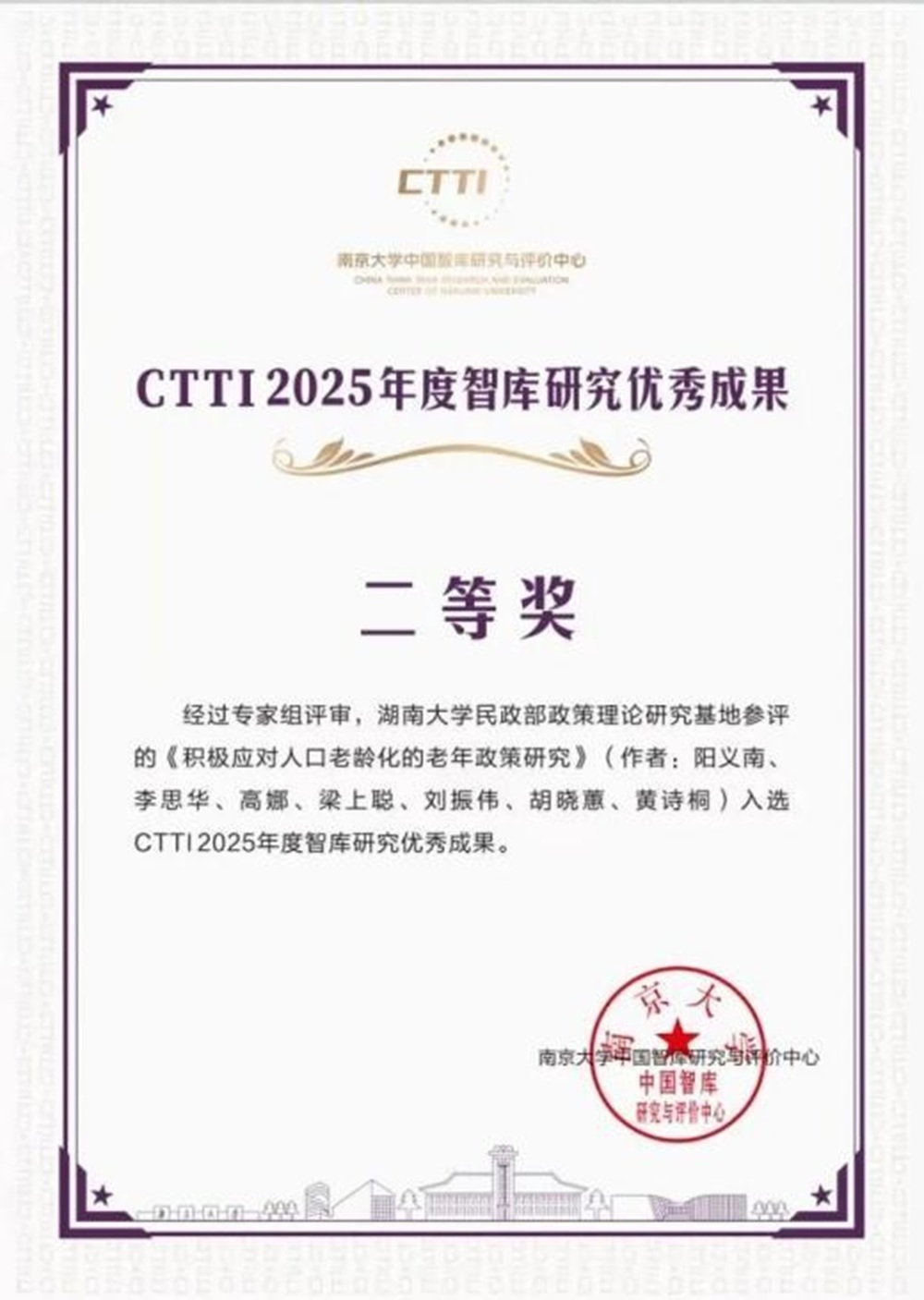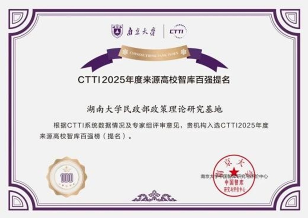 科研项目与智库服务能级稳中向好。获国家社科基金4项、教育部社科项目1项、全国老龄办委托项目1项。智库成果获中央办公厅采纳、省部级领导批示20余项,2项成果获CTTI2025年度智库成果二等奖,民政部政策理论研究基地入选CTTI2025年度来源高校智库百强提名。