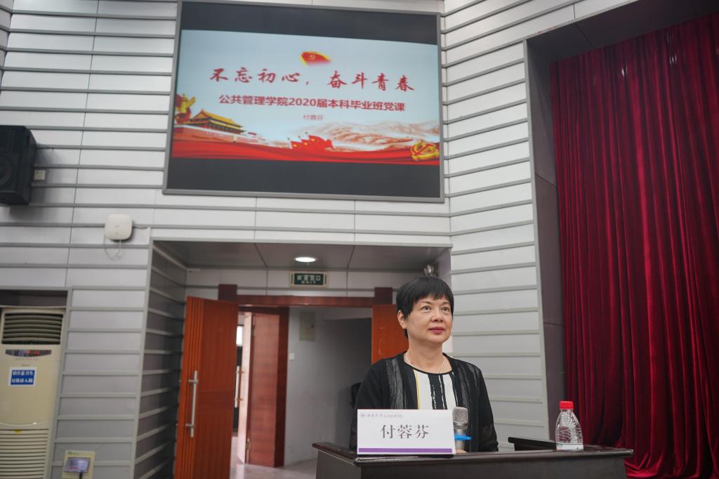 付蓉芬书记从“铭记初心不忘来时路”、“踏实肯干走好当下路”、“志向高远开拓未来路”三个维度进行授课,向同学们讲述了青年人在抗击新冠肺炎疫情中的先进事例,还借用习近平总书记给北京大学援鄂医疗队全体“90后”党员的回信寄语“让青春在党和人民最需要的地方绽放绚丽之花”,鼓励同学们将小我融入大我,将青春献给祖国。