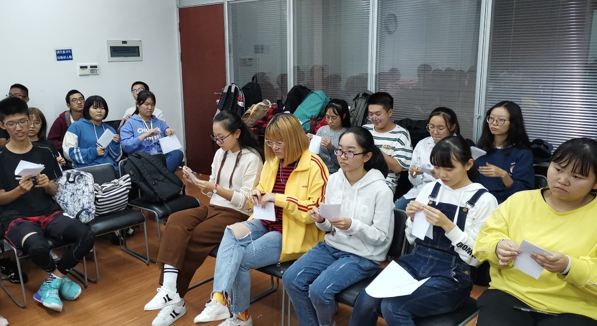 在遇见自己的活动中,同学们被平均分成6个小组参与游戏,通过听取关键词来进行手指逃跑与抓取的活动,以锻炼自己灵活性和反应力,使左右脑均衡发展。通过这个活动大家了解到了集中注意力的重要性,了解了自己在不同情境下的不同反应。