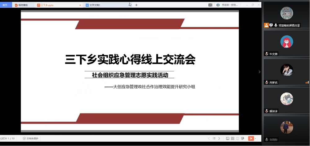 8月13日,小组成员集结在线上进行小组讨论以总结本次实践经验与心得。本次三下乡社会实践活动让小组成员感受到了志愿服务中蕴含的平凡而又伟大的力量,深入了解和切身感受社会组织在应急管理工作中发挥的作用,同时为后续项目调研积累积经验、提供思路。