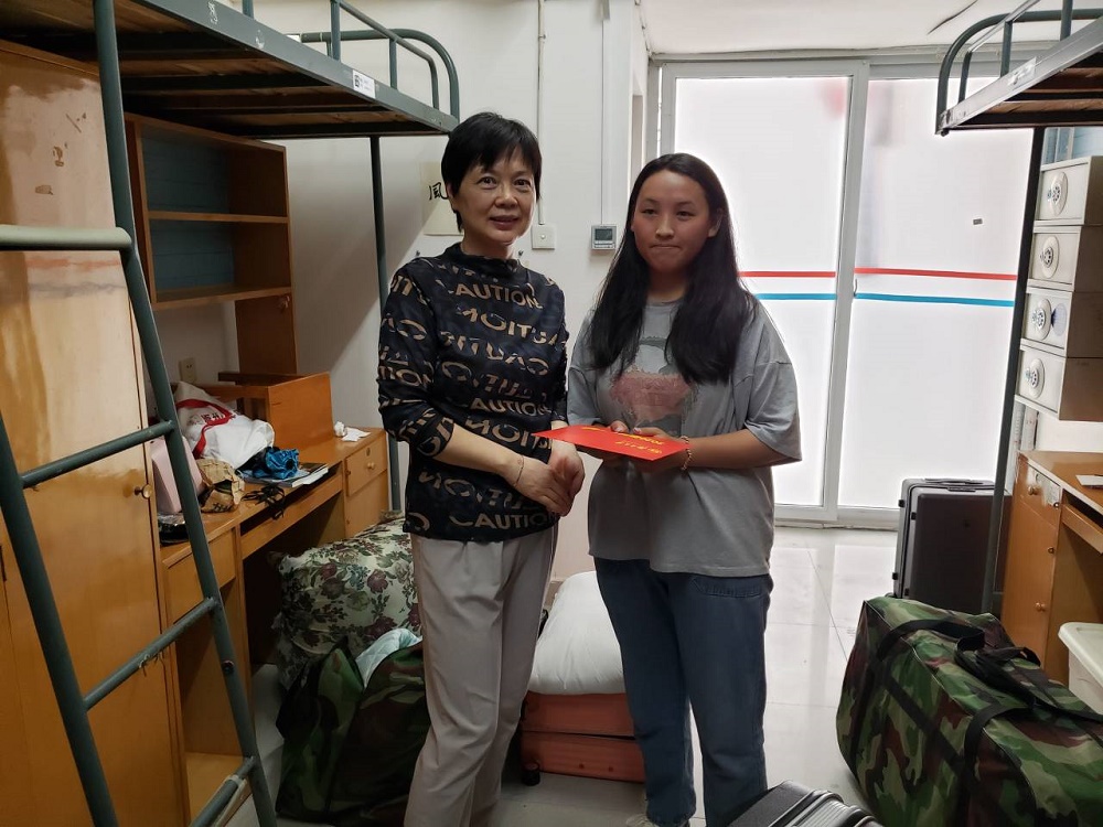 学院党委书记付蓉芬、党委副书记杜倩博在新生辅导员闫振振老师的陪同下走访看望了新生,并为扎西央宗同学送去慰问金和爱心大礼包。付书记和杜老师还来到迎新分流引导台,与迎新团队成员及志愿者亲切交谈,了解新生入学情况并指导迎新工作。