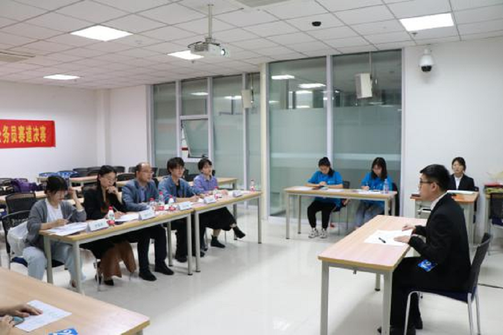本次决赛面试以结构化面试形式进行,共三道考试题目,考生在思考室思考看题时间5分钟,后进入面试教室作答,作答时间5分钟。面试教室设有五名面试官、一名计时人员和两名计分人员,考场外设有引导人员和纪律监督人员,整场面试公平公正、严肃认真。