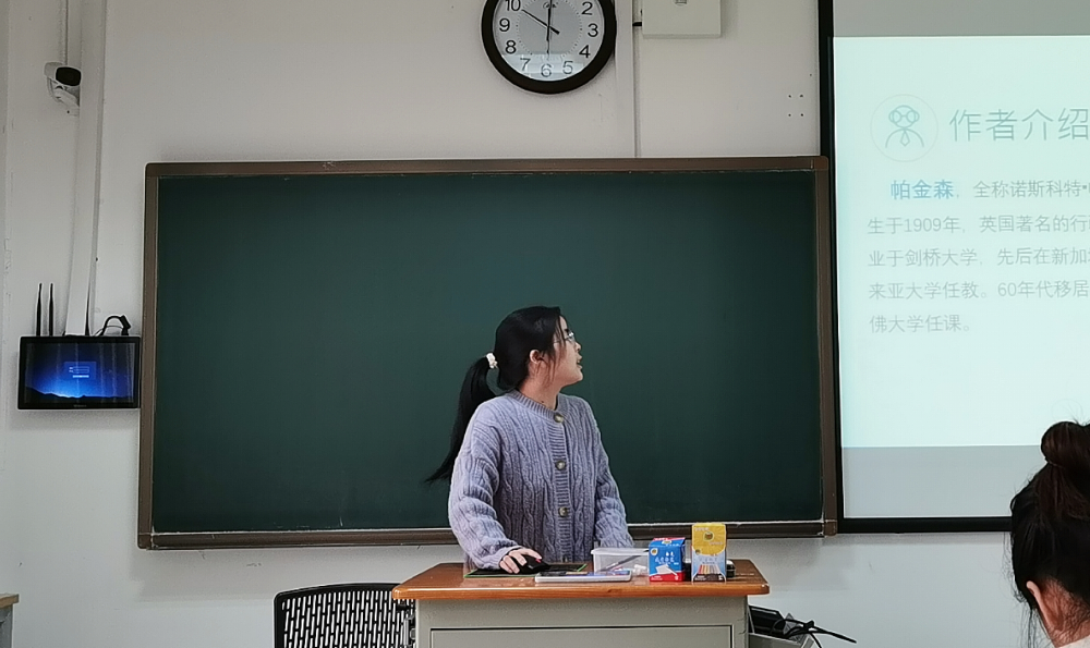 王麒隆同学做简要开场白后,刘媛同学首先为同学们带来了她的读书分享。“帕金森定律是什么?”刘媛同学分别从作者介绍、情境引入、主要理论阐释和启示四个方面对帕金森定律进行了较为系统的解释说明。“植物学家的任务不是去除杂草。他只要能够告诉我们野草生长得有多么快就万事大吉。”虽然帕金森并没有就这个问题提出具体解决办法,但我们也可以从他的理论中吸取可用之处,应用于生活。