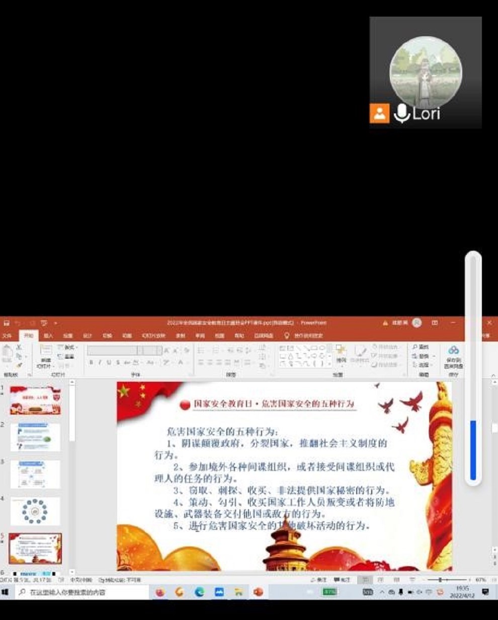 2022年4月15日是我国第七个全民国家安全教育日。为推动国家安全法治宣传,增强同学们的全民国家安全意识和法治意识,行政管理1902班于4月12日开展了全民国家安全教育主题班会活动。本次班会由团支书黄建丽主持,行政管理1902班全体同学参加,为配合疫情防控工作,本次会议以线上会议形式开展。