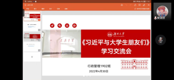 《习近平与大学生朋友们》这本书通过25篇访谈实录,讲述了1983年12月至2019年7月间,习近平同志在河北正定、福建、浙江、上海和到中央工作以来,与大学生们交往、交流、交心的故事,真实记录了他对青年特别是大学生始终如一的关注、关心、关爱,是深入学习习近平总书记关于青年工作的重要思想的鲜活读本,对做好新时代青年工作、助力当代青年健康成长具有重要的示范意义。为了让同学们更加深入地了解习近平总书记关于青年工作的重要思想,2022年4月30日,行政管理1902班举行了《习近平与大学生朋友们》学习交流会,由行政1902班团支书黄建丽主持,行政1902班全体同学参加。为配合疫情防控要求,此次学习交流会通过腾讯会议APP举行。