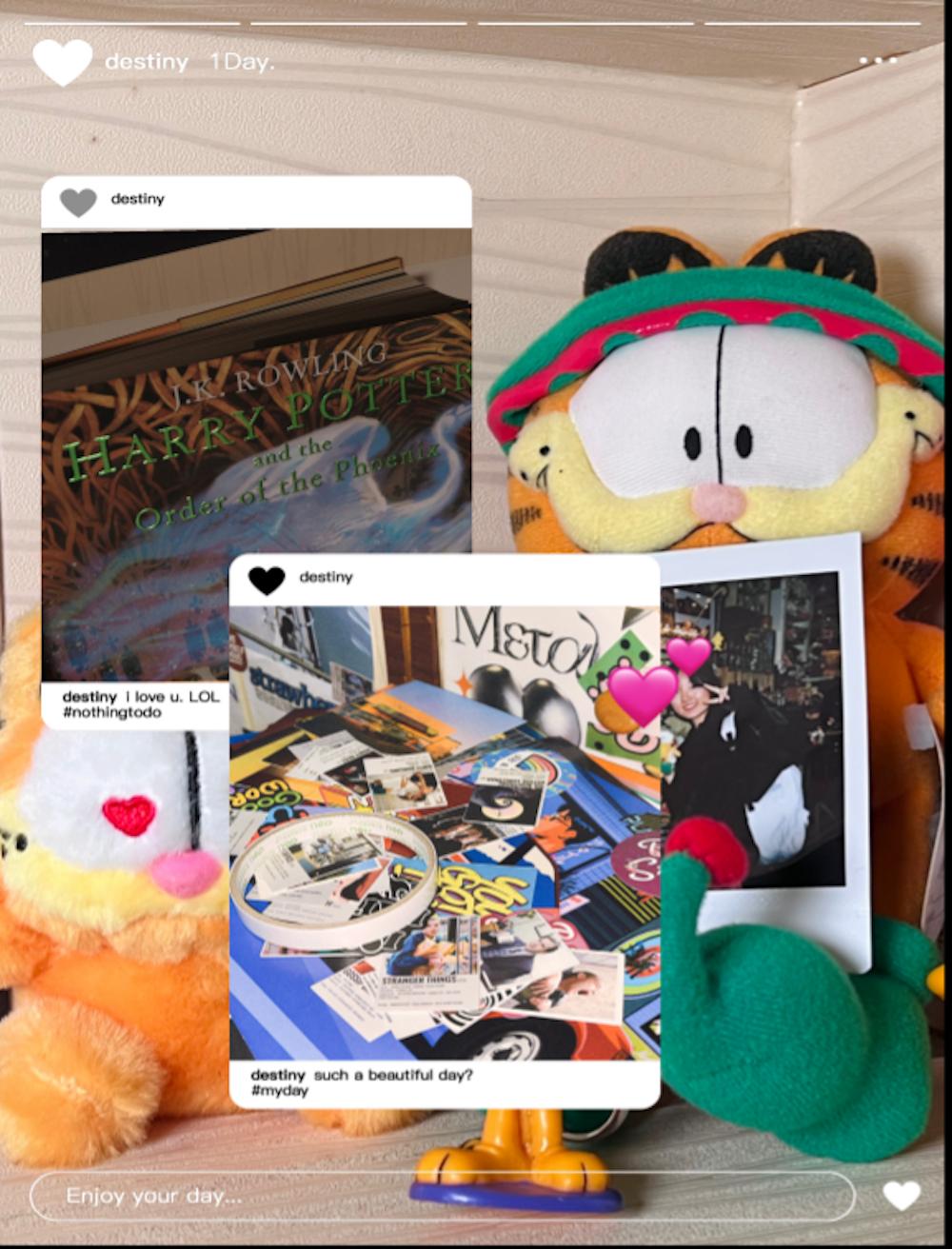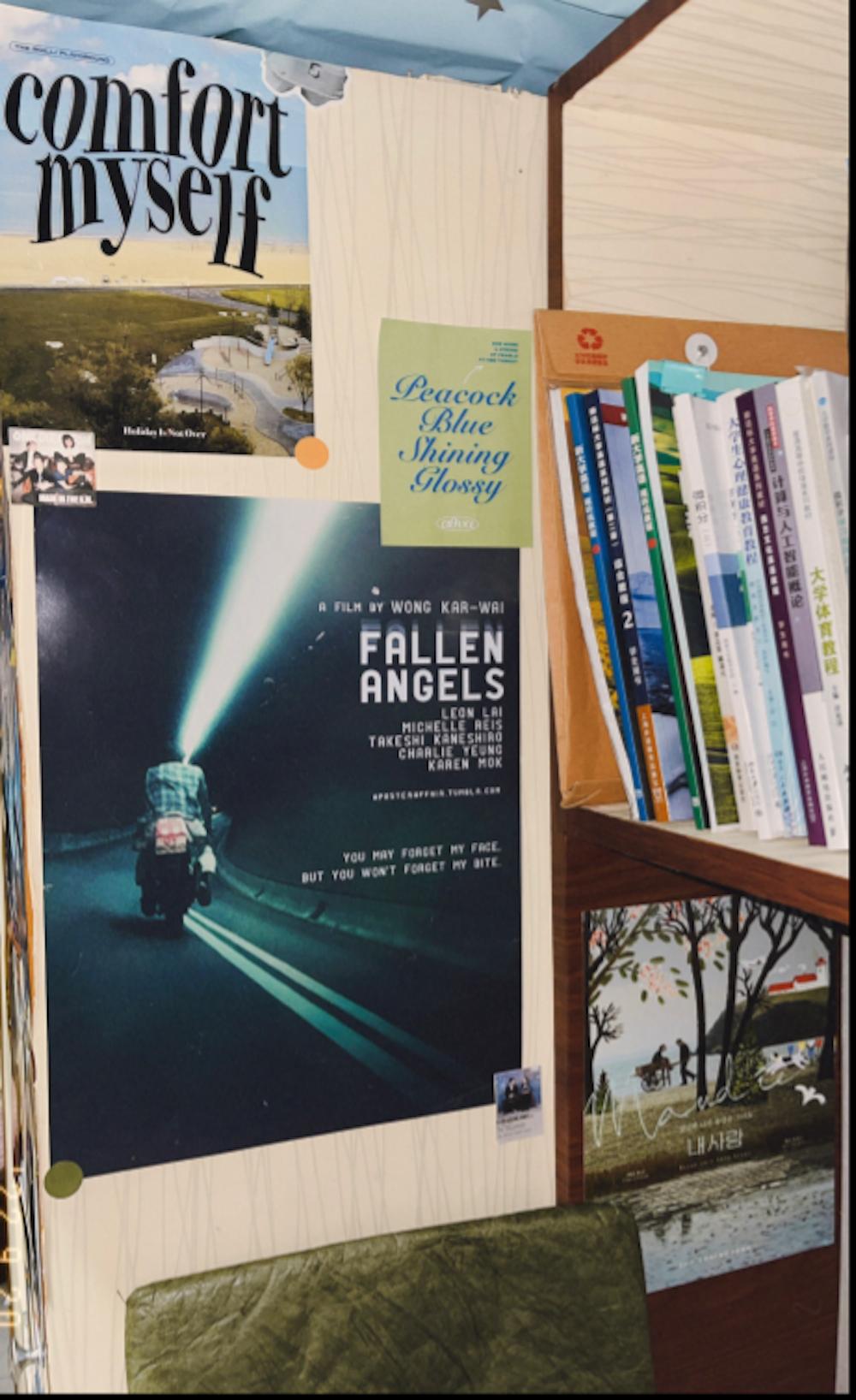一号桌贴着很多精美的海报、摆着可爱的加菲猫,她说贴满自己喜欢的海报和贴纸感觉就有了归属感,很温馨,看着它们会有浓浓成就感和满足感,似乎这片小天地完全属于自己了。