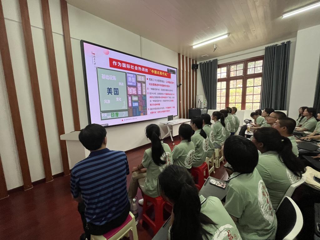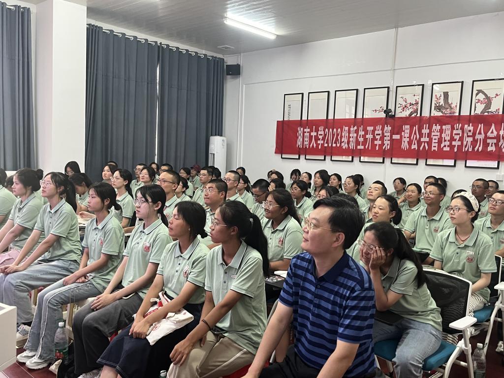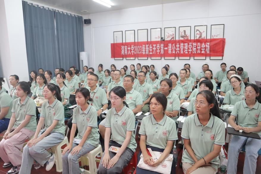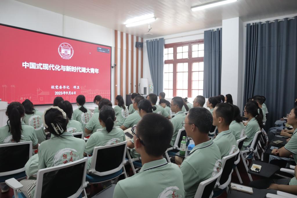 9月6日下午,欧美av 党委书记邓卫老师为全体2023级本科新生讲授了一堂主题为“中国式现代化与新时代湖大青年”的开学第一课。欧美av 15名23级本科新生代表前往欧美av 大礼堂主会场集中聆听,其余新生于欧美av 院楼220与221教室分会场观看直播。欧美av 党委副书记杜倩博老师、辅导员胡春晖老师出席并一同收看直播。