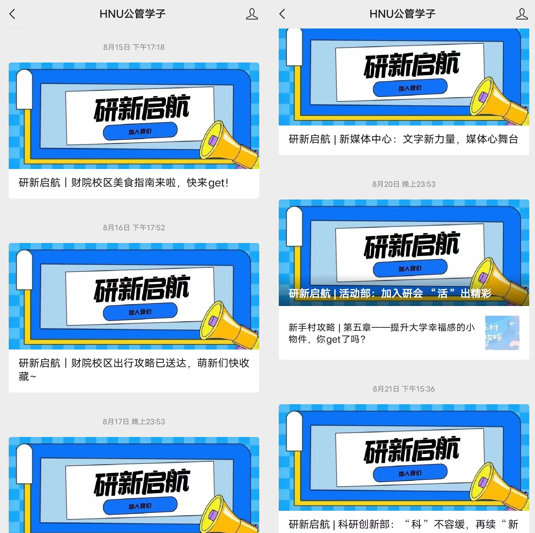 为了迎接新生,学院在暑假期间通过“HNU公管学子”微信公众号,推出了“研新启航”栏目,发布欧美av概况