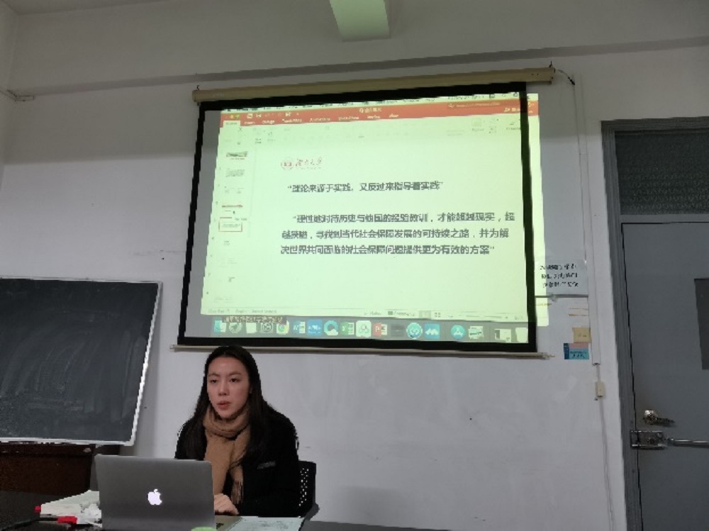 第一位主讲者是孔心悦博士。她首先介绍了本次读书会选读书目的作者及目录,并主要选取第三章内容——社会保障进程的考察,分为三块内容进行分享,介绍了从慈善事业到济贫制度时代再到现代社会保障制度的发展历程,并对现代社会保障的四种模式进行阐述,提出我们在研究中要以史为镜、具有全局观念、并注重效率与公平的协调发展。