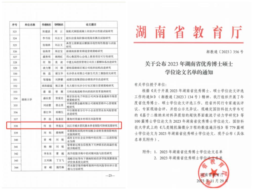 11月29日,湖南省教育厅发布了《关于公布2023年湖南省优秀博士硕士学位论文名单的通知》(湘教通〔2023〕356号)。文件表示,按照《关于开展2023年湖南省优秀博士、硕士学位论文评选工作的通知》(湘教通〔2023〕134号)精神,湖南省教育厅开展了年度省优秀博士、硕士学位论文评选工作。经省外同行专家通讯评议、专家现场会评,并经公示无异议,共有779篇硕士学位论文被评为2023年湖南省优秀硕士学位论文。