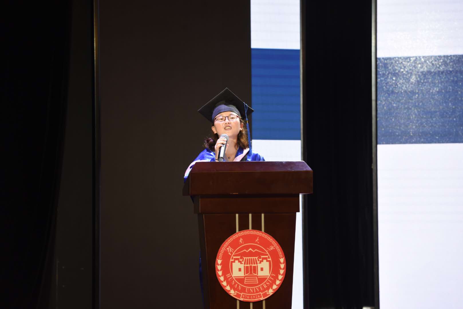 导师代表李金龙教授回忆了同学们的成长历程,几年时光匆匆而过,老师的话中饱含着对同学们的自豪、期翼与不舍,老师的寄语一定会铭记于心间,让同学们在今后的人生道路上时刻鞭策自己,奋勇直前。紧接着本科毕业生代表王甜同学与MPA毕业生代表汪玮同学依次上台发言,她们们向谆谆教诲自己的老师以及无时不刻关心自己的父母表达了深深的爱意与感激。四载励志求学,一朝鲲鹏展翅。两位同学用真挚朴实的语言描述了大学四年的心路历程,她们说:“四年里,学校图书馆换了新的系统,麓山南路进行了大范围改造,地铁四号线成了我们的校车;四年里,我们与身边的同学一起从愣头愣脑的模样,完成了从小清新到成熟的华丽转身。”