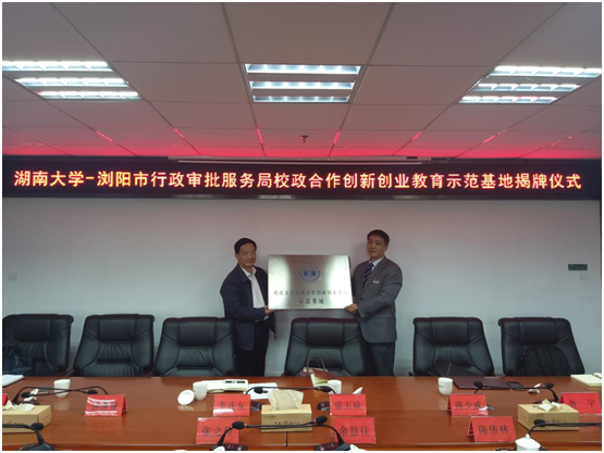 校政合作创新创业教育示范基地的挂牌仪式。浏阳市行政审批服务局党组书记、局长余慧佳,浏阳市编办主任张之俭等参加此次仪式。