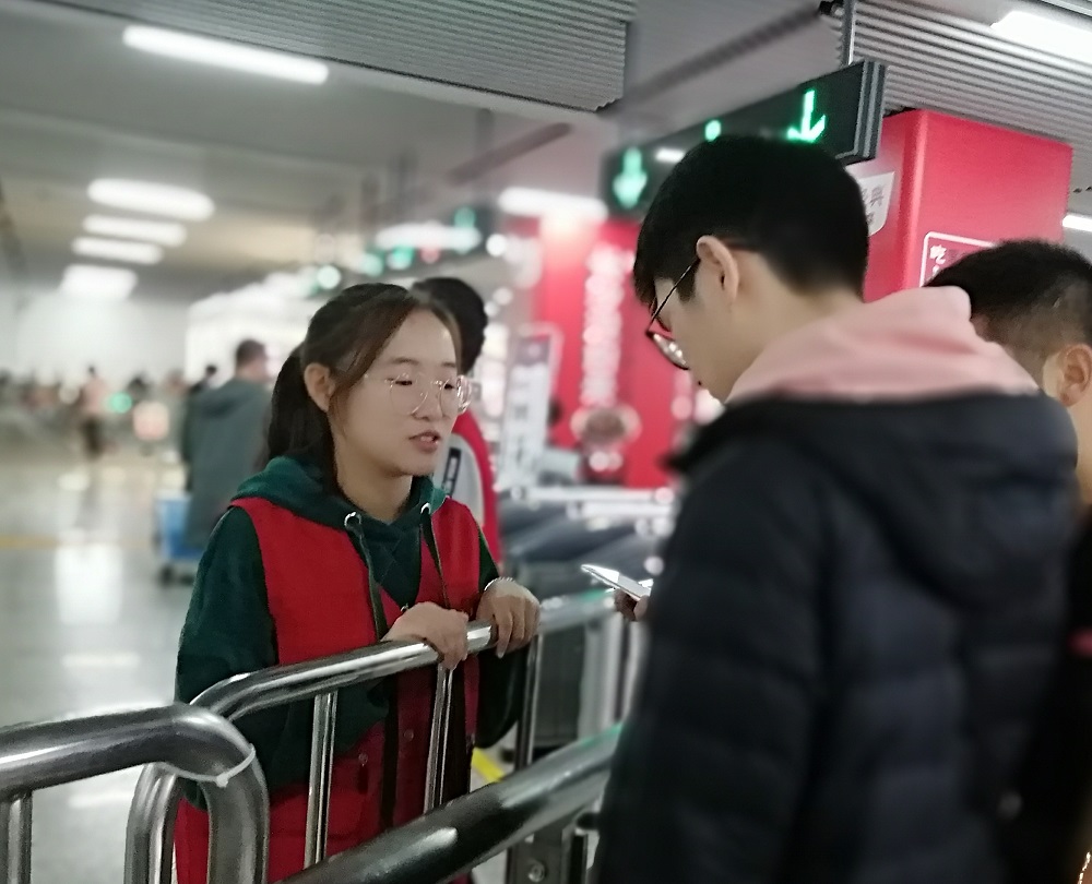 因服务过程中要求志愿者们长时间站立引导来往乘客,活动负责人安排志愿者们轮班执勤,让志愿者们能呈现出更好的精神面貌,为乘客提供更好的服务。10月26日早六时二十分,第一班次的志愿者们就到达五一广场地铁站。在地铁相关负责任人简单培训和引导后,志愿者们积极地投入到志愿服务工作中。由于地铁站结构复杂、乘车路线多、人流量大,很多乘客不熟悉购票方法和乘车流程,志愿者们详细解答乘客们的疑问,耐心解决乘客们的问题。TVM引导岗处的志愿者主要协助乘客们有序的购票,提醒他们不要拥挤、排队等候等,还帮助没有带现金的乘客使用地铁app扫码购票,闸机引导处的志愿者们则为来往的乘客解答乘车路线相关问题并指引乘车道路,有效地为乘客们的出行提供便利。在两天的志愿服务过程中,志愿者们的值班时间长,休息时间短,在人流高峰期工作量大。但每一位参与服务的同学都认真完成工作任务、热情主动地为乘客服务,为乘客们提供最快捷、最便利、最贴心的服务。