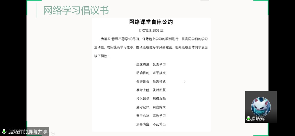 班会上,腊炳辉首先带领全班进行本学期的的展望,着重介绍大二下半学期班级整体规划,帮助同学们认清自己、找准目标、规划未来。其次,通过学习党中央、国务院关于疫情防控的决策部署,腊炳辉结合专业知识为同学们分析了当前疫情形势,并提醒同学们在未收到各省市或国家宣布解除疫情之前,各位同学不可掉以轻心,应保护好自己,同时把疫情期间“停课不停学”落实好。随后开展“如何上好网络课”大讨论,同学们讨论制定网络课堂自律公约,在班委的牵头下制定班级网络课堂自律公约,胡亚辉作为代表为同学们朗读了这一公约。自律公约由班委发出倡议,全体同学共同参与制定,旨在督促同学们认真积极地进行线上教学,推动班级学风建设。