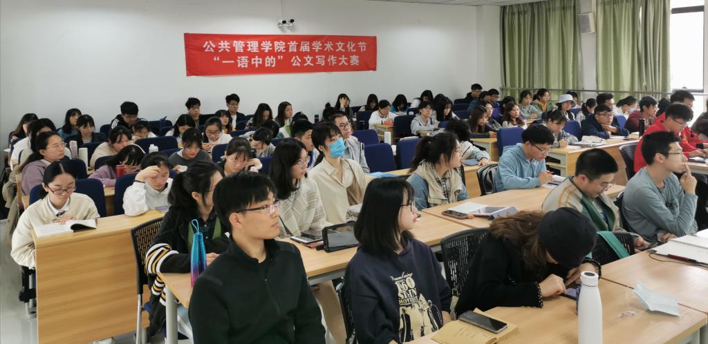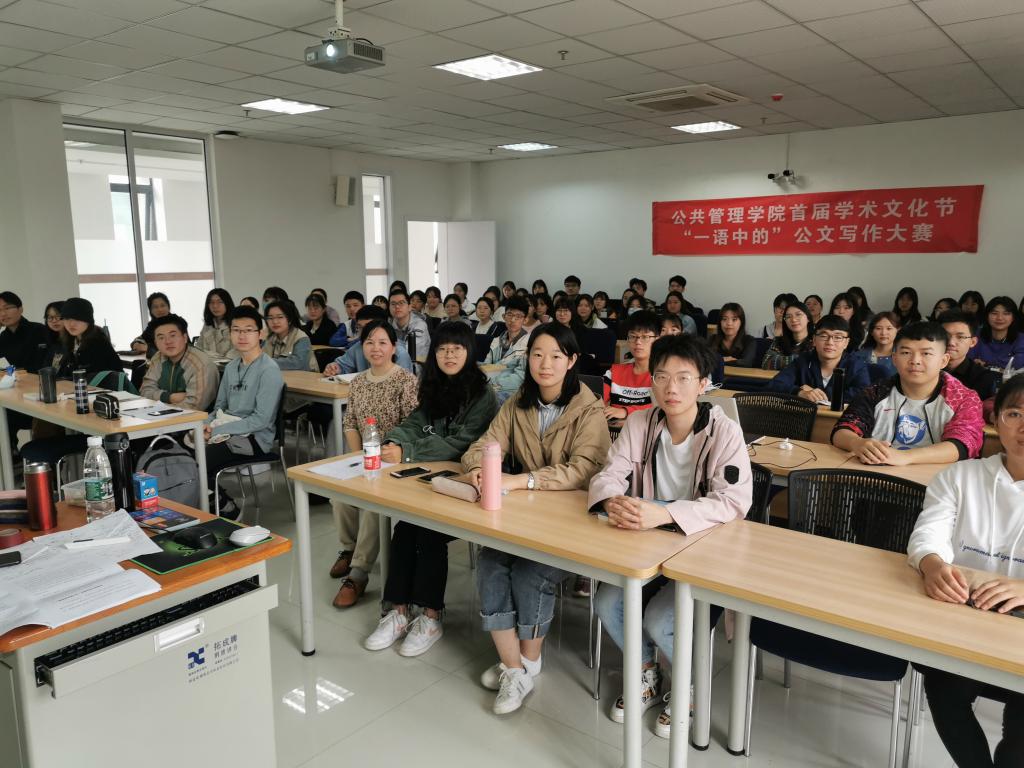 于研楼B403教室召开首届学术文化节系列活动之“一语中的”公文写作点评会。本次公文写作的主题为“推进C市政府‘垃圾分类’工作”,要求参赛学生以C市委办公厅工作人员的身份,为C市委书记撰写讲话稿。本次会议由占小林老师主讲,2018、2019级全体本科生参加会议。