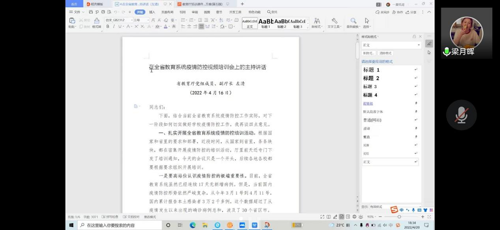 为切实提升新冠肺炎疫情防控工作人员常态化防控和应急处置能力,持续强化广大师生员工自我管理责任意识,行政1901、1902班根据省教育厅《关于做好全省教育系统新冠肺炎疫情防控培训的通知》文件精神,并结合学校实际,于2022年4月20日进行防控培训,由班长陈楠主持,行政1901、1902班全体同学参加。为了配合疫情防控工作,本次培训在腾讯会议APP举行。
