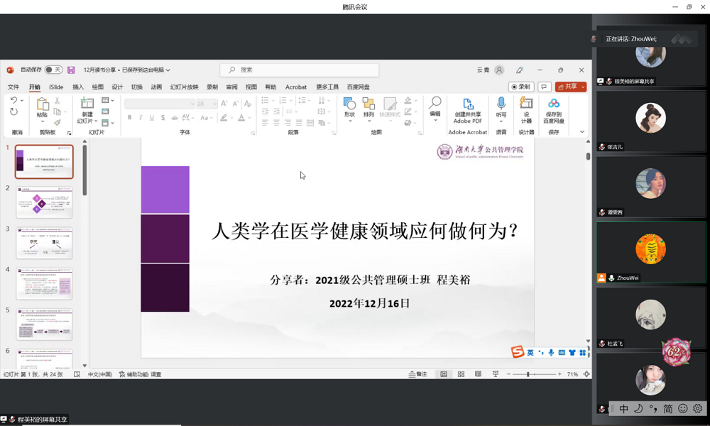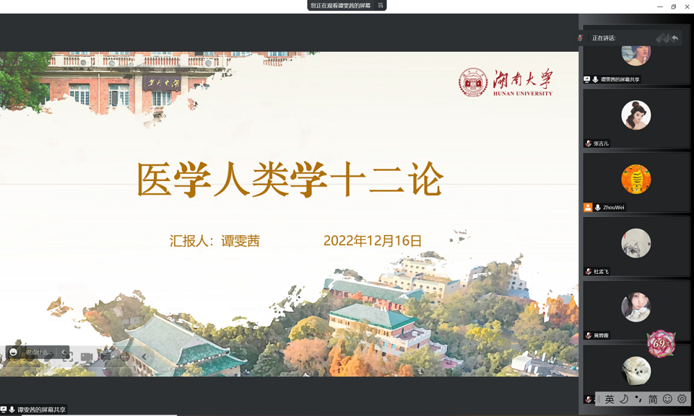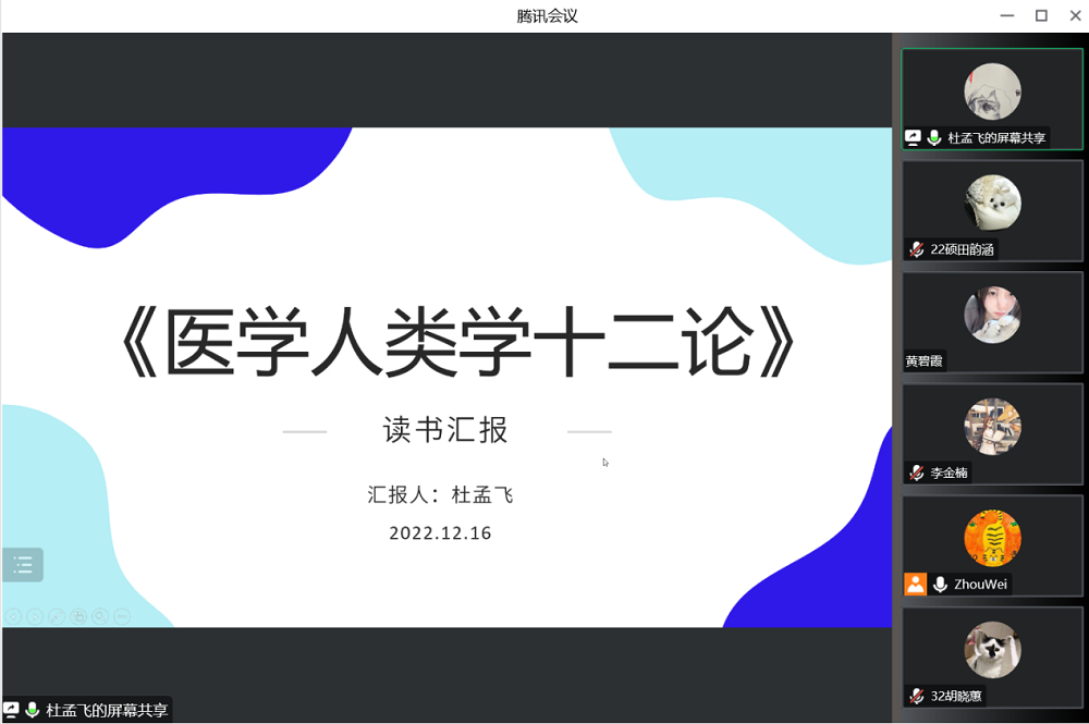 公共健康与社会保障研究所第14期“品读经典”读书会在线上举行。本次读书会分享的经典书目:《医学人类学十二论》(作者:朱剑峰)。本期读书会由周蔚老师主持,硕士生谭雯茜、程美裕、胡晓蕙、杜孟飞先后进行学习分享,研究所十余名研究生参加。