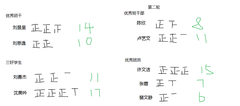 本次评选投票采取无记名投票方式,遵循公平公正公开原则,由段瑞洋唱票,腊炳辉计票,最终评选沈美吟为“三好学生”、卢艺文为“优秀班干部”、刘昱呈为“优秀团干部”、许文洁为“优秀团员”。他们表示将在接下来的学习生活中继续提高自身素质,发挥带头作用,不辜负同学们的期望。