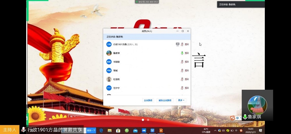 3月21日,行政管理1901班团支部于线上开展入党推优大会,本次会议由团支书方晶主持。