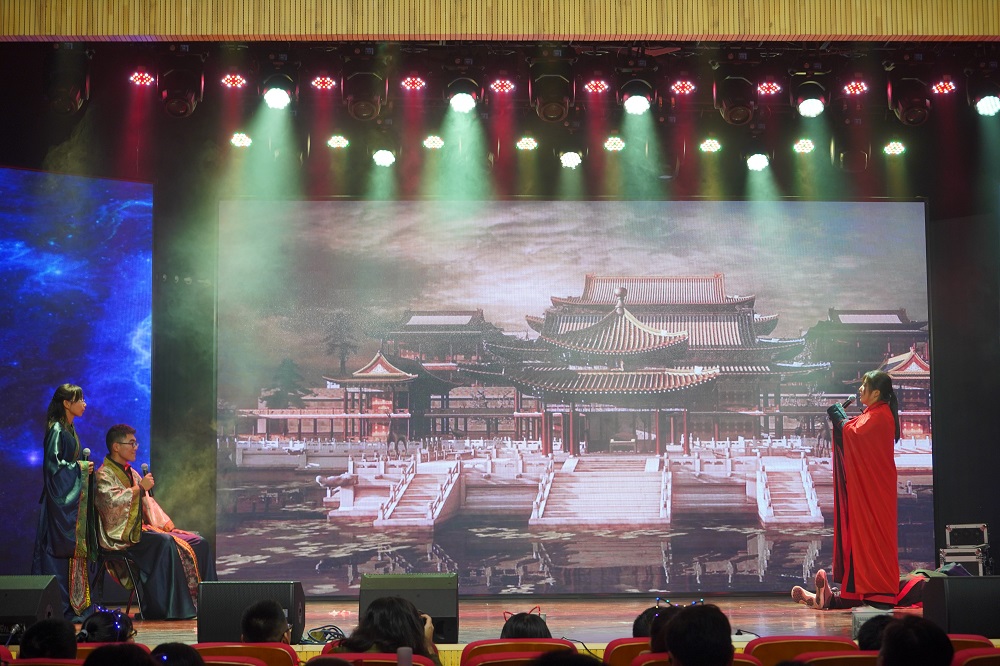 接下来,来自行政管理1901班和1902班的 “葫芦六兄弟”将音乐作为一种情感载体,用古风诠释爱情,用音符连接家乡与梦想,用电音配合双截棍打出最炫酷的律动,给观众不一样的音乐体验,收获全场的掌声与喝彩。在阵阵的惊奇和赞叹中,费梓萱、桂滨钰带来的双人舞《少年的你》用优美高超的舞姿再次展示了电影的主题,展现不一样的少年的你。在余音绕梁中,行政管理1901班的默剧《人生》,展现了一对青梅竹马的一生,幽默又不失真情,搞笑与真理并存,时不时令观众捧腹大笑。