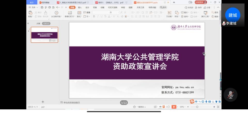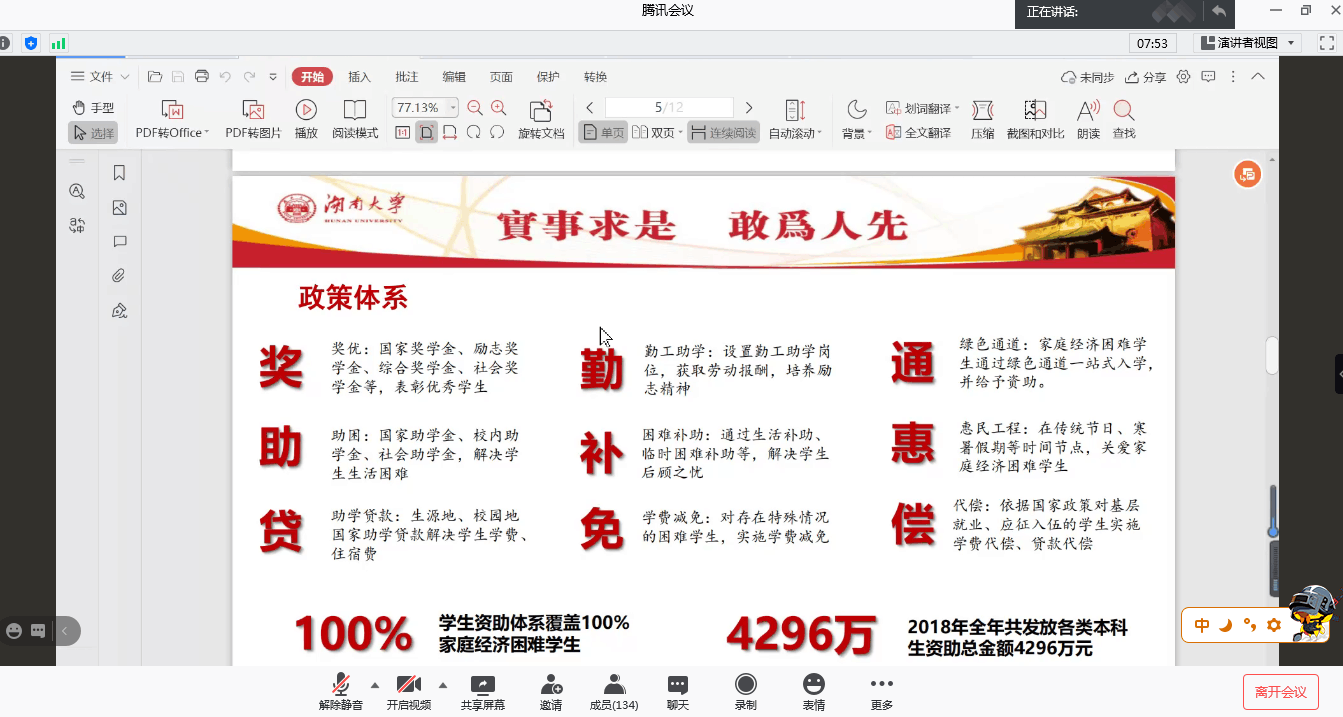 会议伊始,闫老师就资助工作开展的指导思想、工作目标以及工作路径做了简单介绍,让大家对于国家的“四位一体”发展型资助体系有了一个简单了解,随后指出了国家、学校对于学生资助工作的重视程度。接着闫振振老师又为大家详细介绍了由“奖、助、贷、勤、补、免、通、惠、偿”九项资助政策构成的欧美av